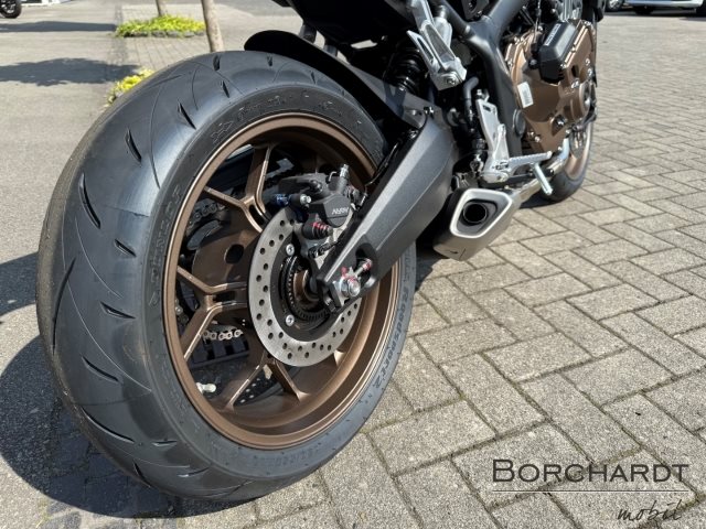 Du hast es in der Hand. Der DOHC-Vierzylinder-Reihenmotor leistet in der Spitze 70 kW (95,2 PS) der rote Bereich beginnt bei 12.000 U/min und bietet ein Drehmoment von 63 Nm. Honda Händler können das Bike für alle mit A2-Führerschein auf 35 kW drosseln und die Drosselung entfernen, sobald ein A-Führerschein vorgelegt werden kann. Da Leistung Kontrolle braucht, verhindert die Anti-Hopping-Kupplung das Blockieren des Hinterrads bei starkem Bremsen und Herunterschalten. Das Notbremssignal (ESS) wird bei Vollbremsungen aktiviert und sorgt so für bessere Sichtbarkeit auf der Straße.