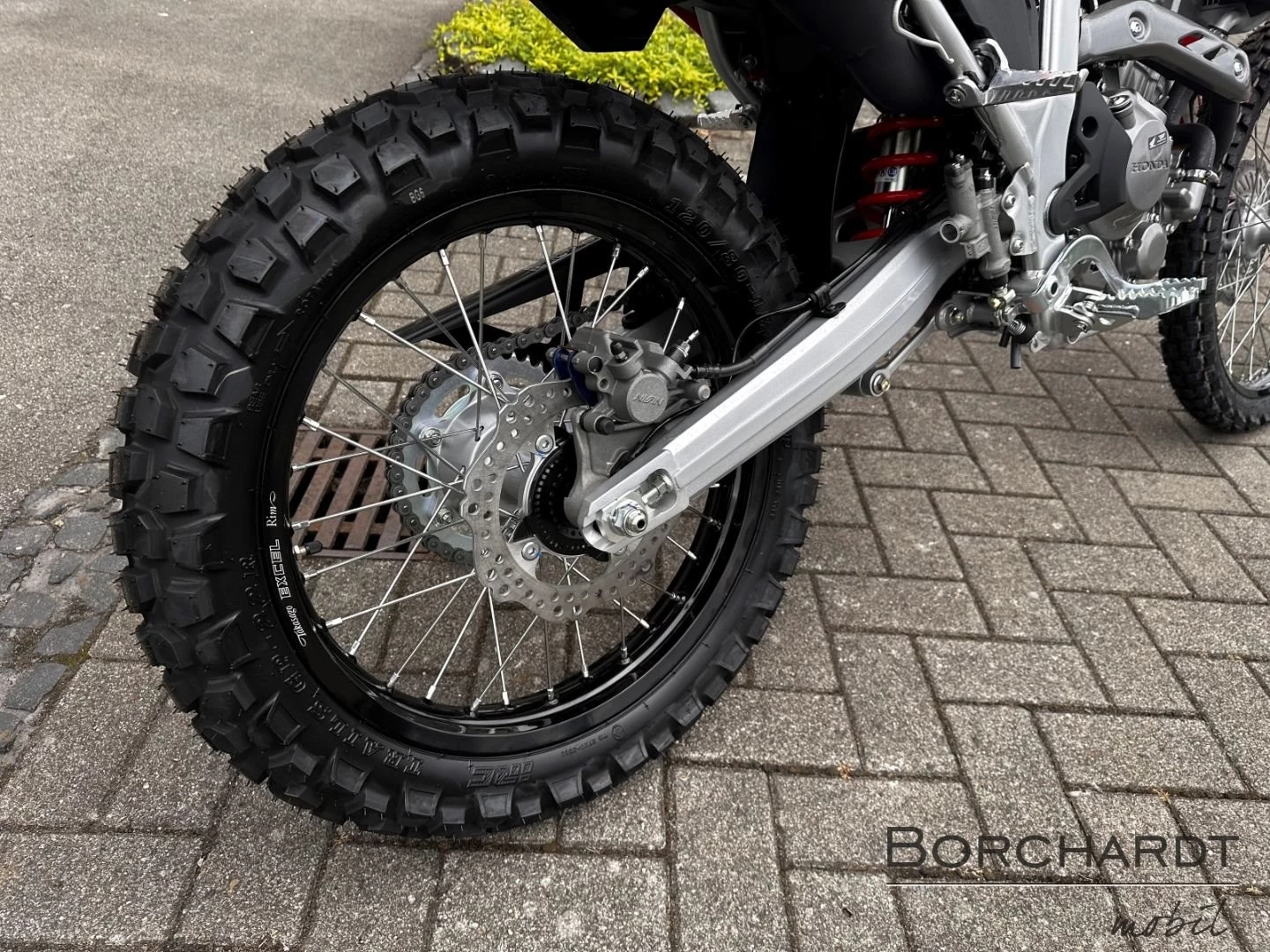 Das überarbeitete Fahrwerk verbessert die Balance und das Handling. Die obere Aufhängung erfolgt jetzt über Lager und zeichnet sich durch Anpassungen an der Dämpfungskraft der hinteren Federung aus, was den Bodenkontakt des Motorrads und damit die Traktion optimiert. Die höhere Dämpfungskraft der Vorderradaufhängung verbessert zudem die Gesamtstabilität, was die Fahrt komfortabler macht. Der leichte Rahmen und die konisch zulaufende Aluminiumschwinge vereinfachen das Handling bei Richtungswechseln auf der Straße und im Gelände gleichermaßen. Dieses Motorrad ist perfekt für Entdecker.