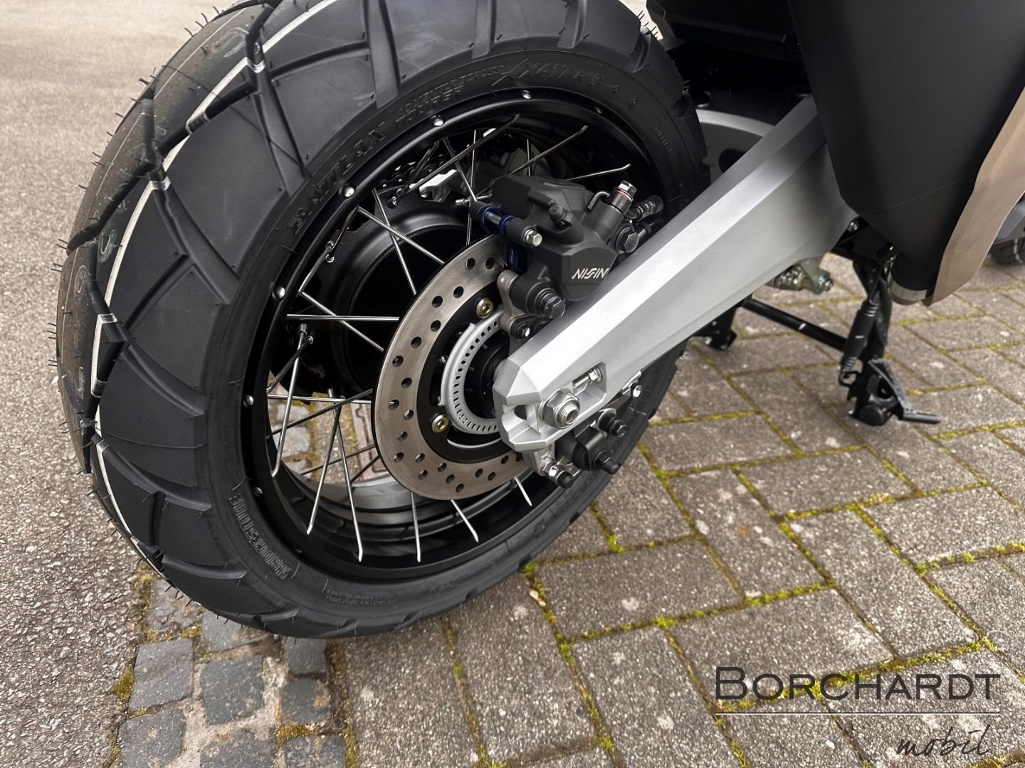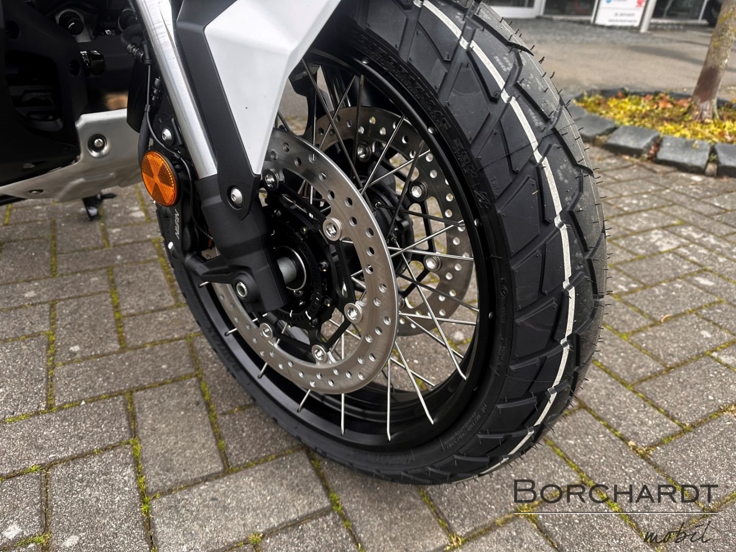 Ob in der Stadt oder im Gelände, das wendige Chassis des X-ADV bietet immer ein tadelloses Handling. Dafür sorgen die Stabilität des Diamantrahmens aus Stahlrohr sowie die Stoßdämpfung der USD-Gabel mit langem Federweg (153 mm/130 mm vorn bzw. hinten) und das Pro-Link-Federbein hinten. Dank der aufrechten Sitzposition hast du alles im Blick und unter Kontrolle. Die Sitzhöhe beträgt 820 mm und der Sitz selbst (jetzt mit 10 % mehr PU-Schaum) ist bequem und so geformt, dass du den Boden leicht erreichst. Noch mehr Vorteile? Die Kombination aus einem 17-Zoll-Vorder- und einem 15-Zoll-Hinterrad und einer Reifengröße 120/70 R17 vorn und 160/60 R15 hinten bietet Grip auf Motorradniveau.
